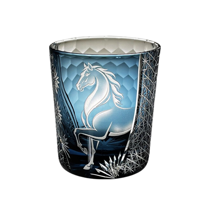 This glass is offered in two refined expressions. The Aoi-Meiba version carries a serene blue tone that enhances the brilliance of the cuts and gives the horse a luminous presence. The Kuro-Meiba version presents a deep black body, allowing the motif to emerge with a bold and dignified silhouette that changes subtly under different lighting.