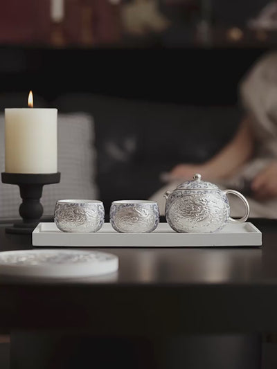Inspired by the serene motifs of the Imperial Palace, this tea set captures the elegance and tranquility of a lotus pond within the Forbidden City. Each piece is adorned with a meticulously engraved lotus pattern, symbolizing purity and enlightenment in Chinese culture. The design is then accentuated with delicate silver gilding, applied using a time-honored technique that ensures both brilliance and durability. The lustrous silver against the fine ceramic body creates a striking visual contrast, reminiscent of moonlight gliding over palace waters.