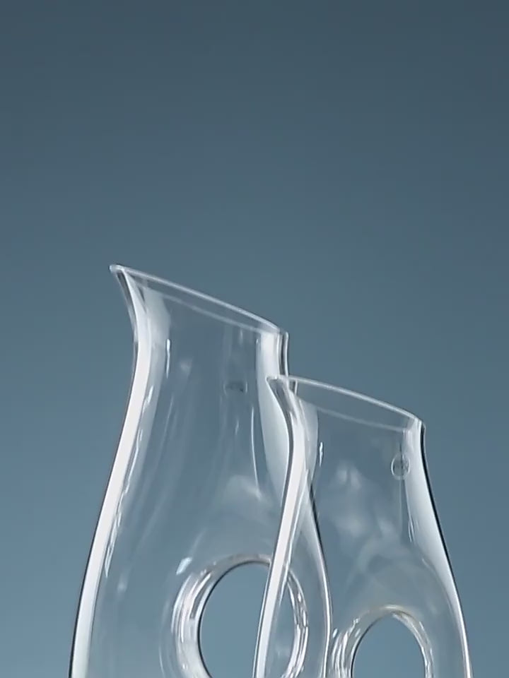 A beautiful marriage of form and function, this hand‑blown crystal decanter set is designed with thoughtful elegance. At its center, a hollow “halo” is gracefully blown into the waist of each decanter—serving both as a striking visual centerpiece and as an intuitive, comfortable grip for pouring. This clever detail enhances stability and ease of use while creating an enchanting play of light through the crystal.