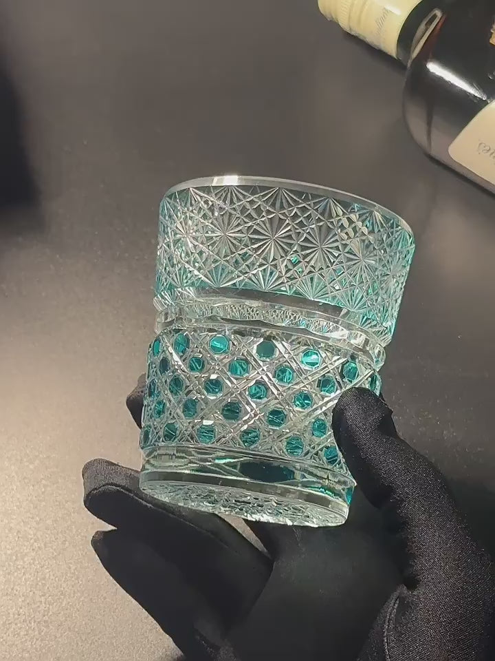 Where crystal becomes a crown of light. This glass is a celebration of faceted brilliance, cut with the precision and grandeur of a jeweler’s art. Using Edo Kiriko’s layered technique, artisans carve intricate, gem‑inspired patterns—prismatic cuts, starburst facets, and cascading angles—into richly tinted crystal in deep emerald, ruby, or sapphire tones. Each plane catches and fractures light, creating a kaleidoscopic play of color and shine.